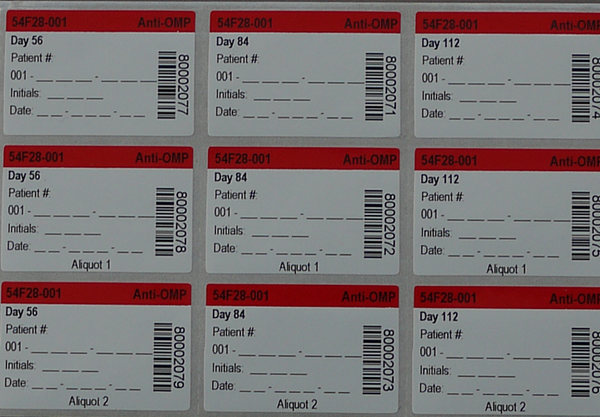 Our cryogenic labels are an excellent solution for Clinical Trials or BioBanks. We can provide them in any size or colour or multiple colours, with a barcode and logo, if required, on A4 Sheets or Rolls. Our custom made labels can also be provided blank for in-house printing.